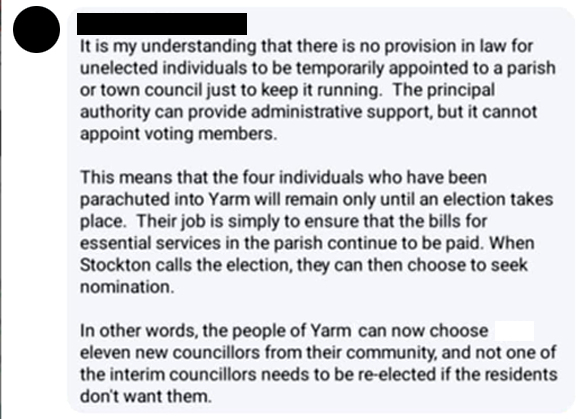 Surprisingly, Cllr Sherris also suggested that the responsibility for electing new Councillors to YTC should NOT fall on electors at all. Fearful of a democratic resolution, Sherris prefers that he, along with two other Conservative Councillors appointed by SBC to YTC, plus Cllr John Coulson, should be the sole arbiters of who is to sit on Yarm Town Council. He wants the 4 SBC Conservative Councillors to decide, without reference to the will of the electors of Yarm! What price democracy, indeed!